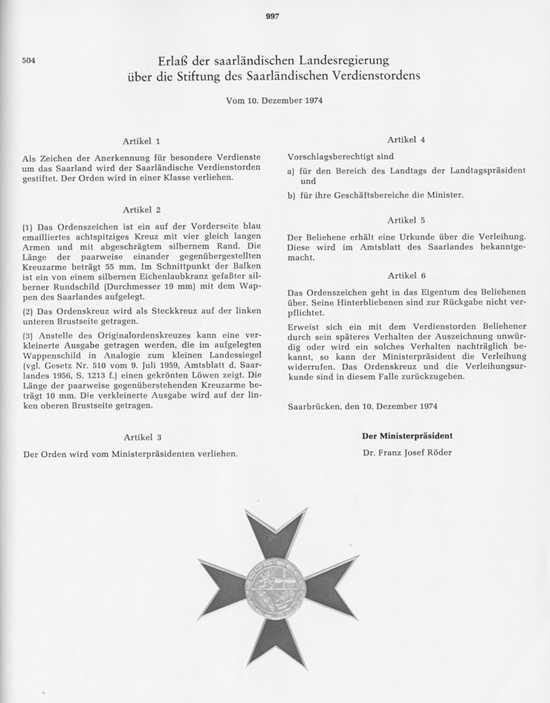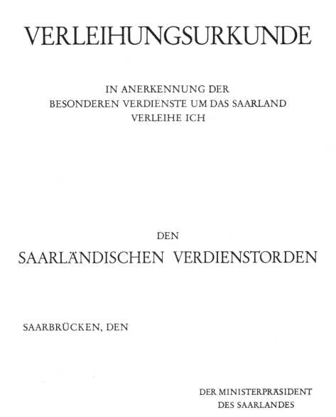 Seit Stiftung wurden bis heute insgesamt 367 saarländische Landesorden verliehen. Die Verleihung erfolgte an 36 Damen und an 331 Herren. (Stand 01.01.2008)