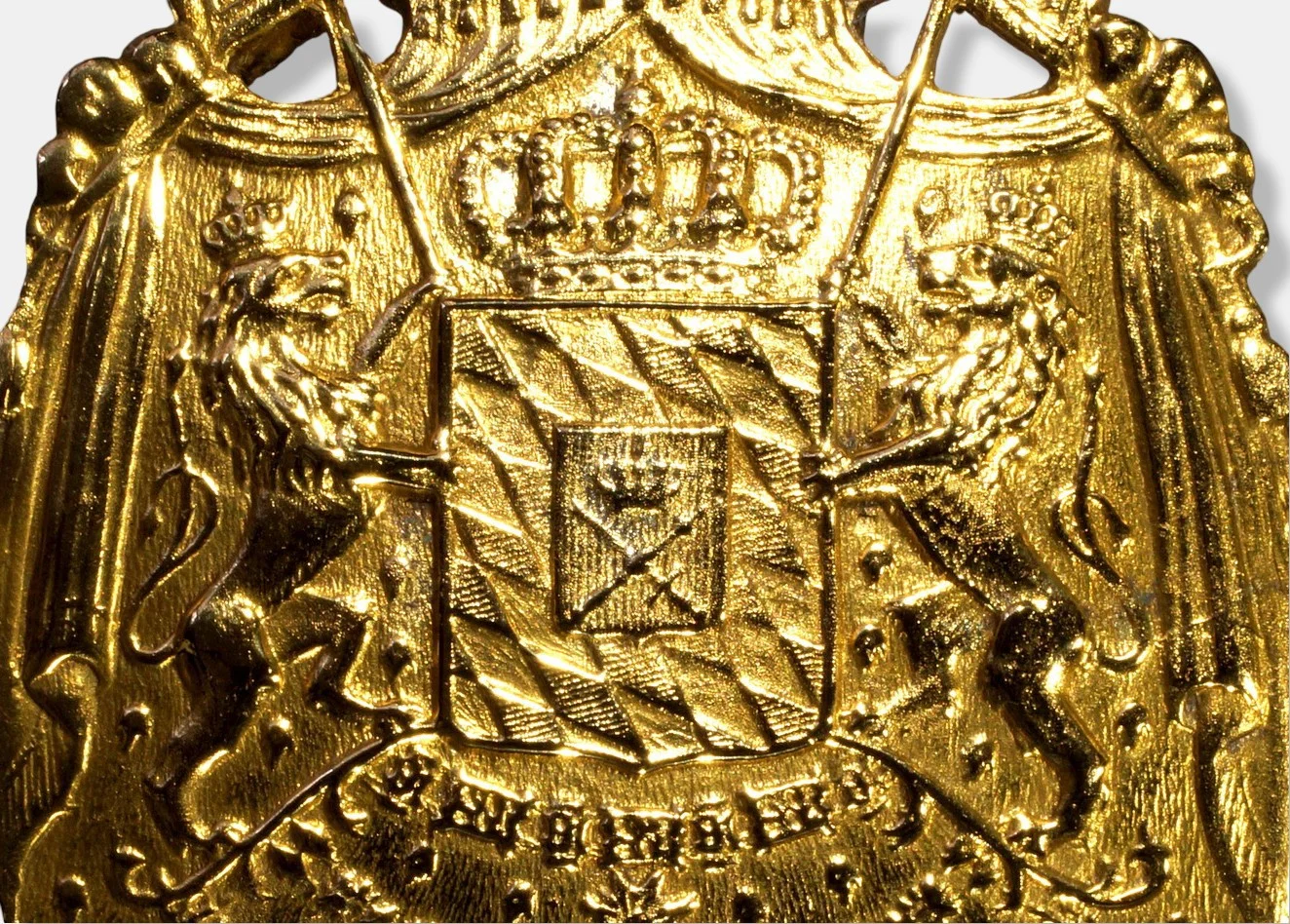 Das dargestellte Wappen mit Schwert und Zepter im Herzschild war bayerisches Staatswappen vom 20.12.1806 bis zum 17.10.1835. Wenn ich die Anzahl der Orden (drei) auf dem Wappen hilfsweise zur weiteren Altersbestimmung heranziehe, dürfte dieses Wappen (mit drei Orden darunter) von 1807 bis spätestens 1818 Verwendung gefunden haben, denn ab 1819 werden bis 1835 mehr Orden unter dem Wappen dargestellt.