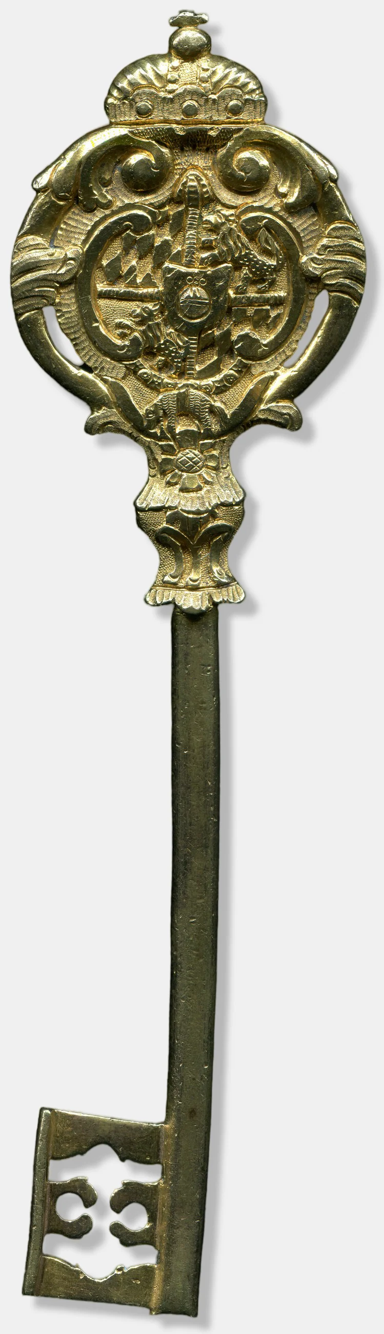 Nur allein auf das Wappen bezogen, würde ich deshalb die Entstehungszeit des Schlüssels abweichend vom DUWE, auf die Zeit von 1820 bis 1835 schätzen wollen. Der vom Prinzregent Luitpold um 1900 eingeführte, etwas kleinere Schlüssel mit dem bay. Staatswappen trägt das Wappen aus der Zeit ab 1835 (bis 1918), mit dem Rautenschild als Herzschild und vier Ordensketten darunter.