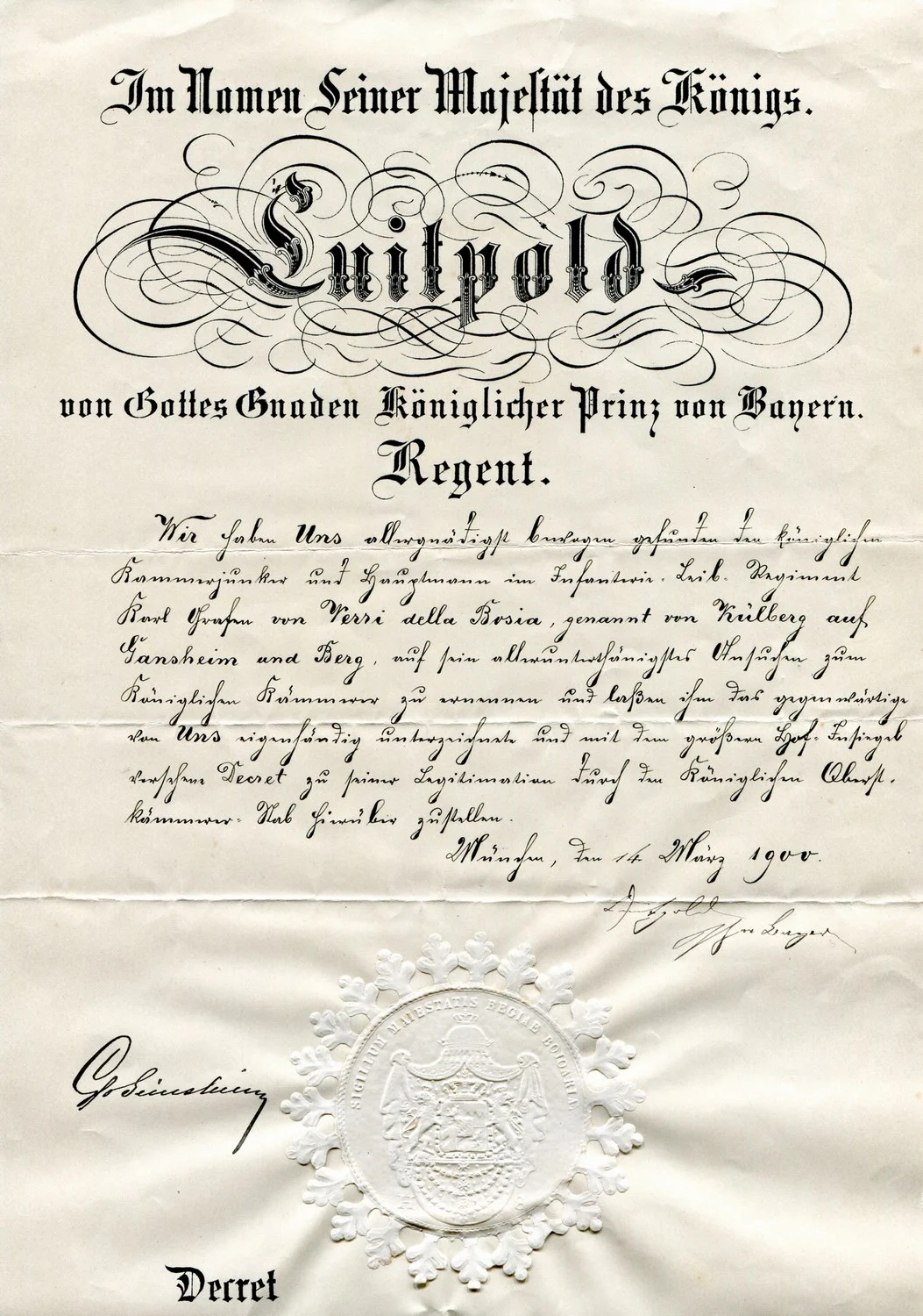 Die Verleihung der Kämmerer-Würde wurde ihm mit Schreiben des königlich baierischen Oberst-Kämmerer-Staabs-Amts vom 15. März 1818 bekannt gemacht.